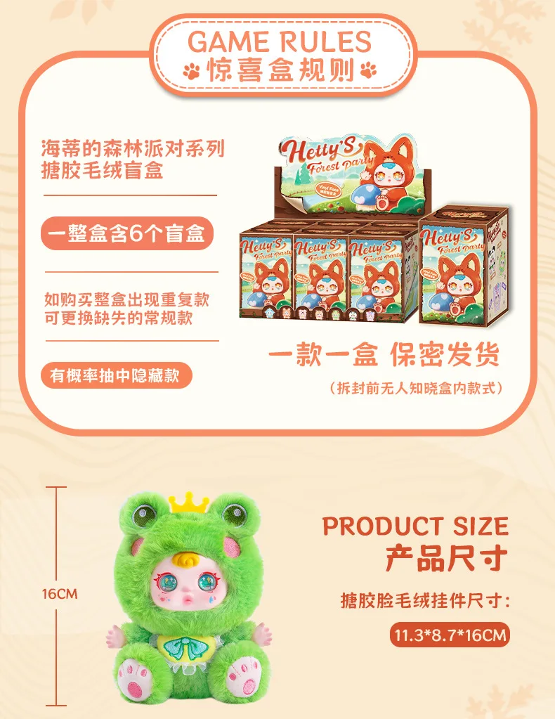 • Blind box format with a surprise plush doll from the Heidi's Forest Party series, designed with adorable forest-themed elements.